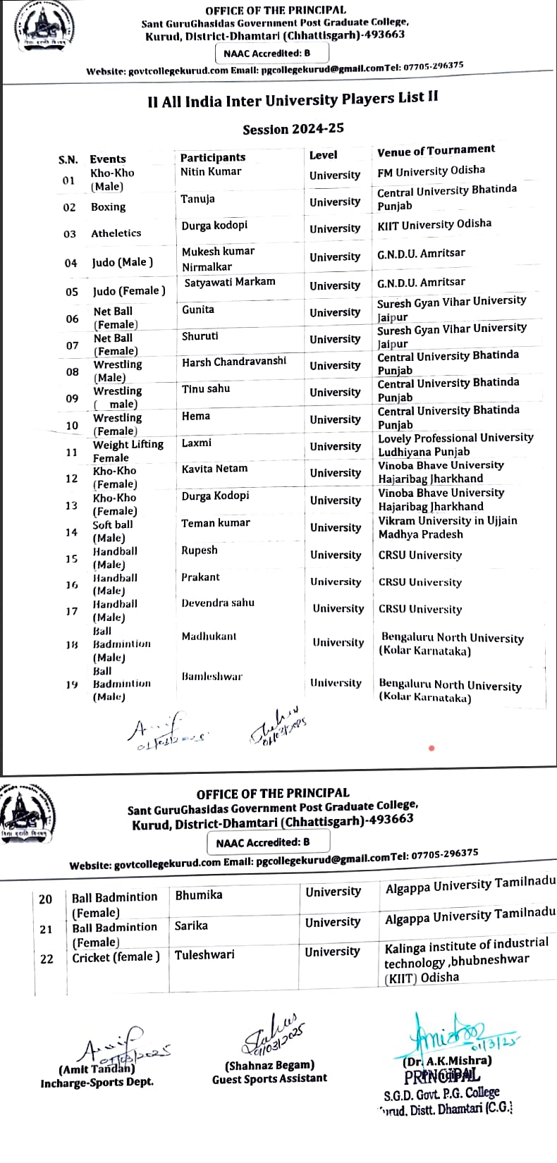 आल इंडिया यूनिवर्सिटी स्तर के खिलाड़ियों की सूची 2023-24