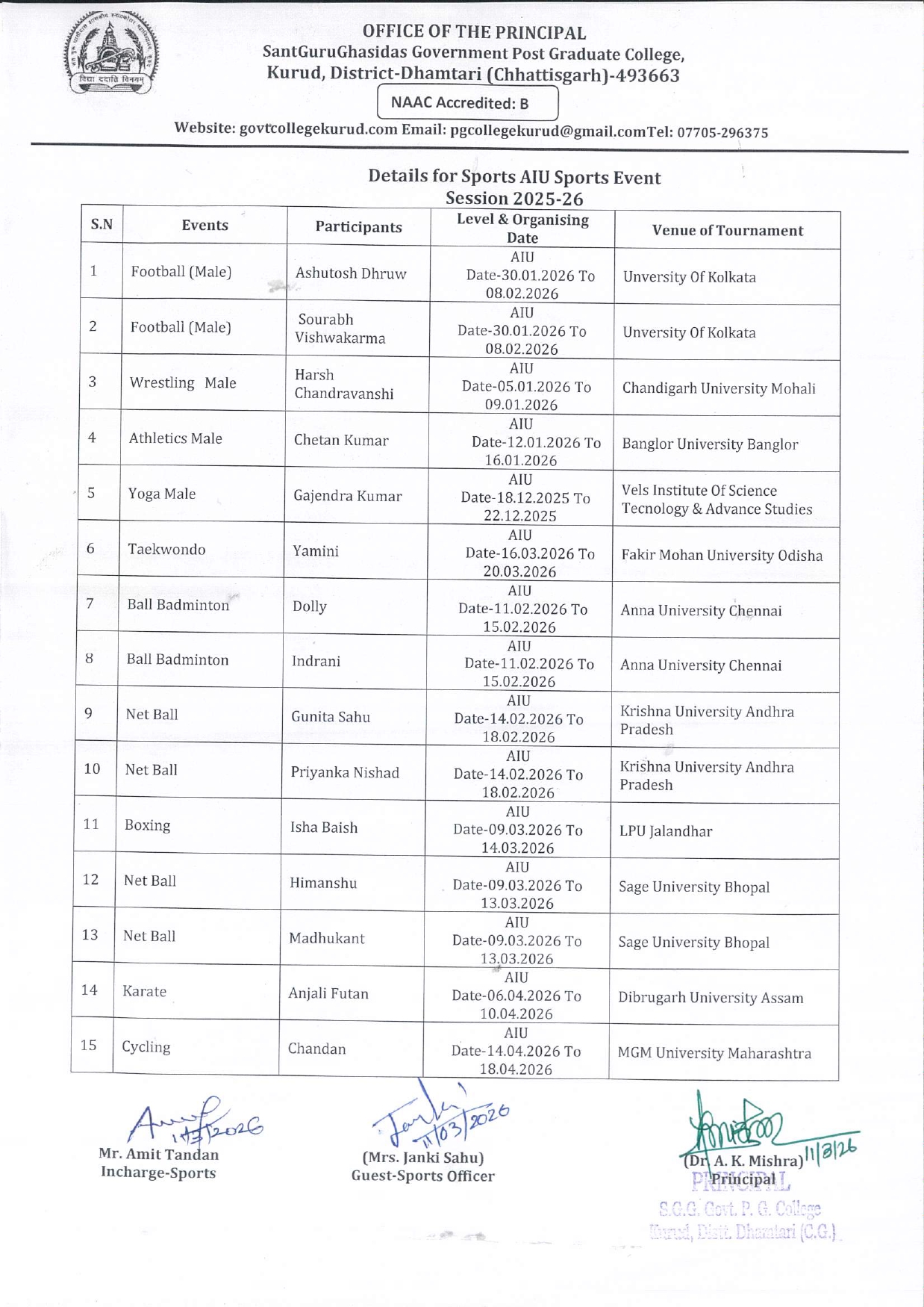 आल इंडिया यूनिवर्सिटी स्तर के खिलाड़ियों की सूची 2025-26