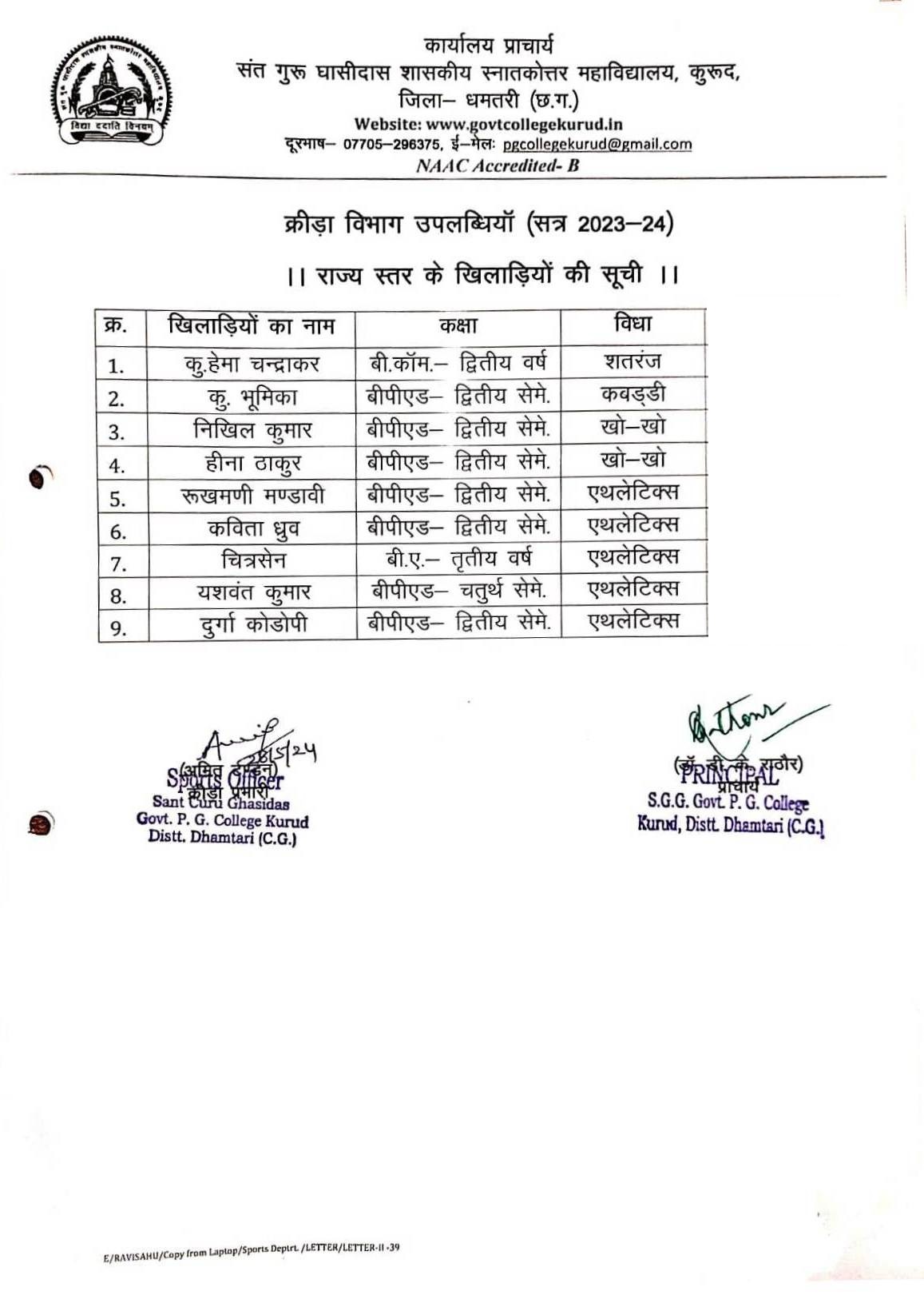 राज्य स्तर के खिलाड़ियों की सूची 2023-24