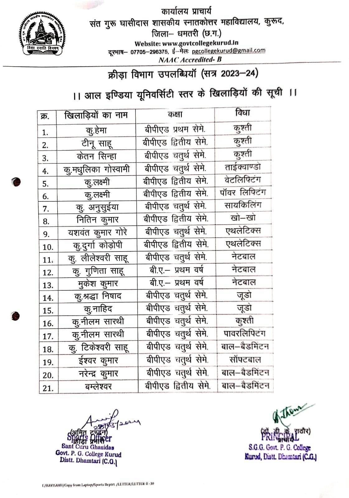 आल इंडिया यूनिवर्सिटी स्तर के खिलाड़ियों की सूची 2023-24